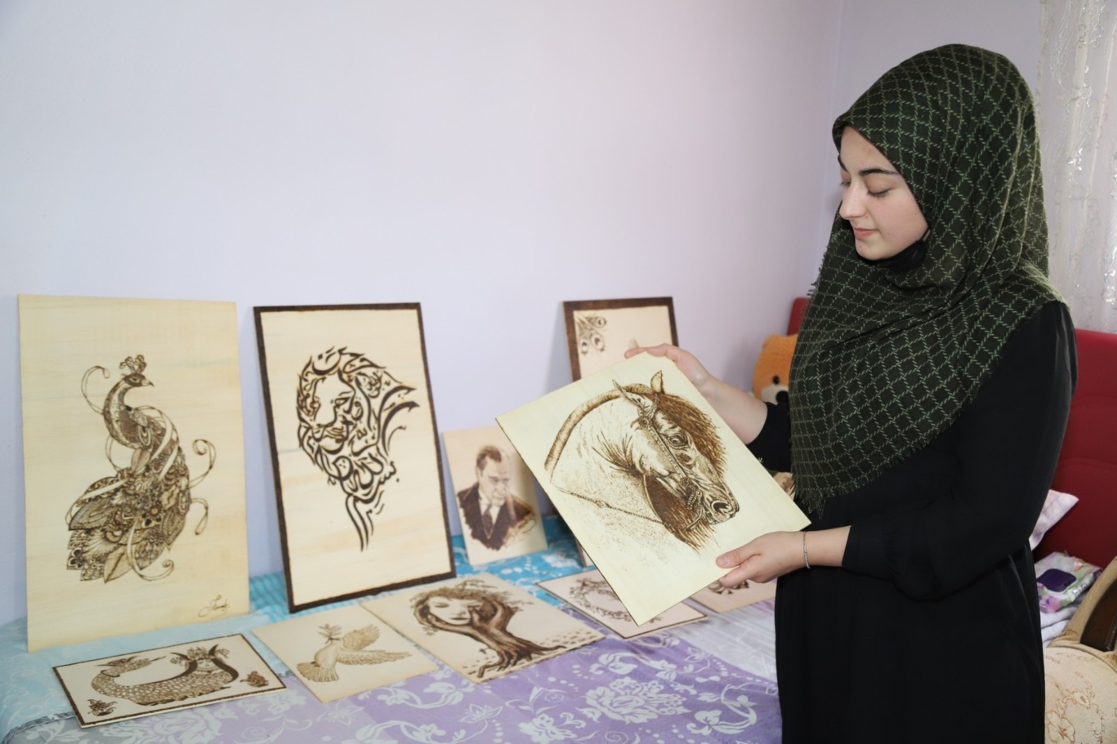 Adıyaman’ın Sincik ilçesinde 11 yaşında yakalandığı hastalıktan dolayı yürüme zorluğu çeken Engelli Sema Nur Aktan (19), ahşap tahta yakarak yaptığı tablolarla tekrar hayata tutundu.