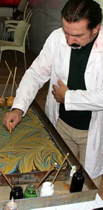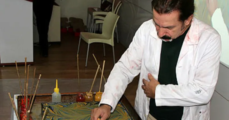 Dağlı daha sonra öğrenciler ve velilere ebru yapılırken kullanılan malzemeleri tanıttı ve ebru uygulaması yaptı.