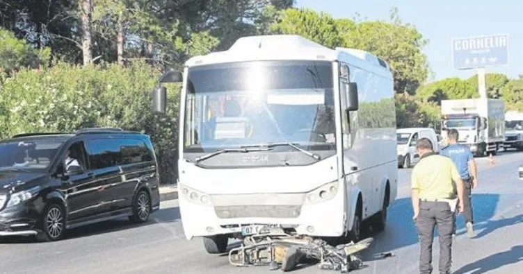 Serik ilçesinde, otobüsle çarpışan motosikletin sürücüsü hayatını kaybetti. Yahya Y. idaresindeki 07 C 82512 plakalı otel personeli taşıyan otobüs, Belek Mahallesi Turizm Caddesi'nde, Seyfettin Toydaş'ın kullandığı plakasız motosikletle çarpıştı.