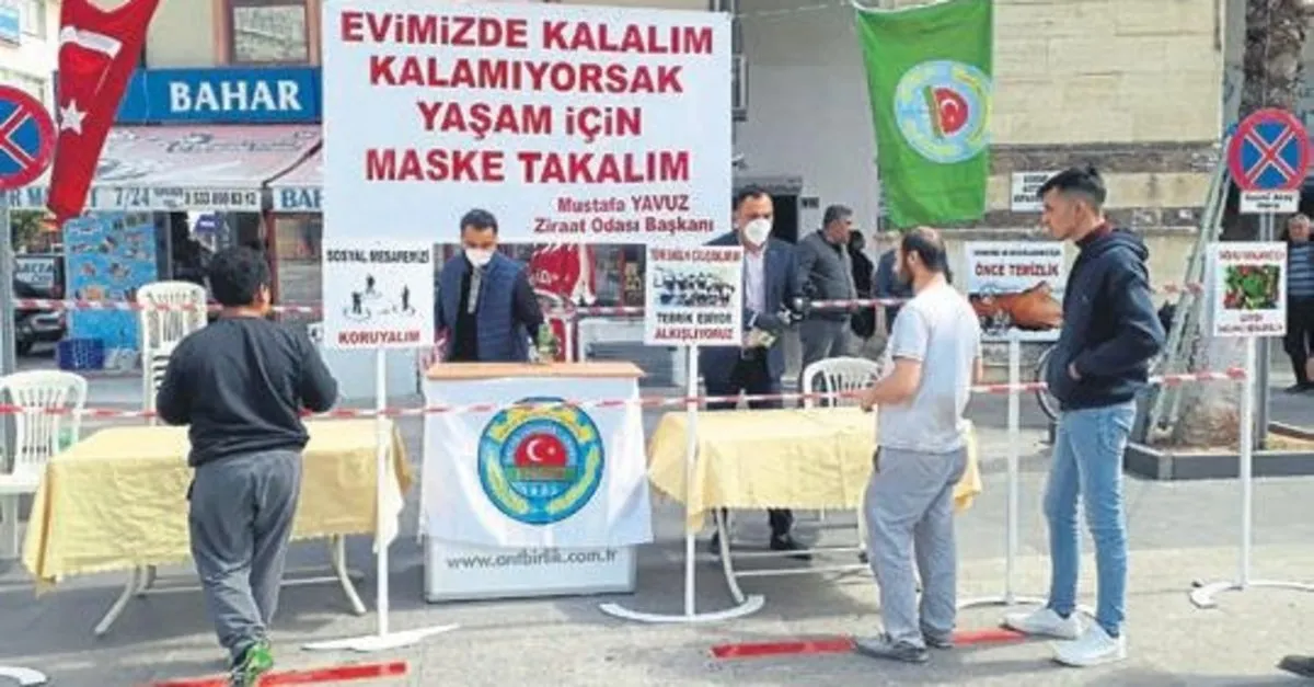 ANTALYA'NIN Serik ilçesinde Ziraat Odası Başkanlığı ve ANTBİRLİK tarafından vatandaşlara maske ve eldiven dağıtıldı, kolonya ikramında bulunuldu. Serik Çınaraltı mevkiinde stant kuran ANTBİRLİK ve Serik Ziraat Odası, Başkan Mustafa Yavuz eşliğinde sokaktaki vatandaşlara 'Evimizde kalalım, kalamıyorsak yaşam için maske takalım' sloganı ile evde kalmalarını, zorunlu sebepler dışından evden çıkmamaları gerektiği konusunda halkı bilgilendirdi. Zorunlu nedenlerle evden çıkanlar için de özel olarak hazırlatılan 50 bin maske ve eldiven halka dağıtıldı. Bu sırada standa gelen vatandaşlara ayrıca kolonya ikramında bulunuldu. Serik Ziraat Odası ve ANTBİRLİK Başkanı Mustafa Yavuz, vatandaşlara evden çıkmama çağrısı yaptı.