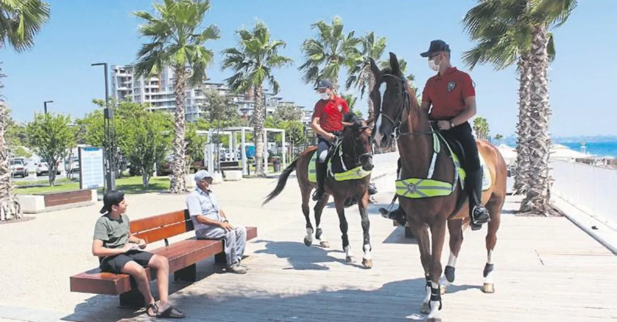 Tüm dünyayı etkisi altına alan koronavirüs salgınında Türkiye'nin mücadelesi dünyada örnek gösterilirken ülke içinde ise en iyi şehirlerden biri olan Antalya takdir topladı. Virüsle mücadelede vaka sayılarının ülke genelinde yükselişe geçmesi nedeniyle vatandaşların tedbirli olmaları konusunda turizmin gözbebeği Antalya'da iş sıkı tutuldu. Turizm sezonu olması nedeniyle yoğunluk yaşanan sahillerde polis ekipleri denetim gerçekleştirildi. Konyaaltı sahilindeki denetimlerde vatandaşlara maske takmaları ve sosyal mesafe kuralına uymaları yönünde uyarıda bulunuldu. Sahilde İl Emniyet Müdürlüğü'ne bağlı 3 birim aynı anda denetimde bulundu. Sunny ve Kazablanka isimlerinin verildiği atlarla birlikle atlı polis birlikleri, martı timleri ve yunus ekipleri sahildeki banklarda, yürüyüş yollarında ve plajlarda görev yaptı.