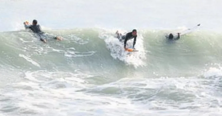 ANTALYA'NIN Alanya ilçesinde görmeye alışık olduğumuz sörf tutkuları, Konyaaltı sahilini de keşfetti. Önceki gün yağış ve kuvvetli rüzgarın ardından çıkan 5 metrelik dalgaları fırsat bilen bir grup sporcu, Konyaaltı sahilinde sörf yaptı. Denize açılarak yüksek bir dalga yakalamaya çalışan sporcular, bu fırsatı yakaladıklarında ise yaptıkları akrobatik hareketlerle izleyenleri şaşırttı. Sahile dalgaları izlemeye gelenler sporcuları yoğun ilgi gösterdi.