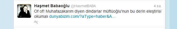 Sabah gazetesi yazarı Haşmet Babaoğlu bugün attığı bir tweet ile takipçilerine önemli bir tavsiyede bulundu. Peki Babaoğlu'nun "mutlaka okunmalı" diye tavsiye ettiği yazı neydi? Öncelikle yazının bulunduğu adres; dunyabizim.com. Haber sitesinde Bursa'da gerçekleştirilen bir seminere yer verilmiş. Seminerin konusu "Küresel Çağda Var Olmak".