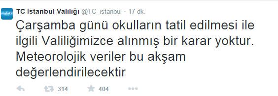 Valilik'ten yapılan açıklamada "Çarşamba günü okulların tatil edilmesi ile ilgili Valiliğimizce alınmış bir karar yoktur. Meteorolojik veriler bu akşam değerlendirilecektir" denildi.