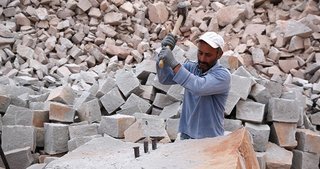 Balyoz seslerinin birbirine karıştığı taş ocağında işçiler, büyük kaya parçalarının altını kazmalarla oyarak ana kayadan işleyecekleri parçayı ayırıyor. Kaya, büyük çivi (murç) ve balyoz darbeleri yardımıyla küçültülüyor.