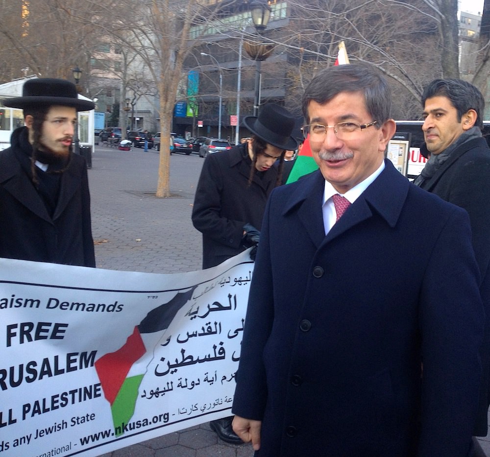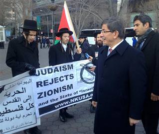 Protestocuları memnuniyetle karşılayan Ahmet Davutoğlu ''Ben bu grupları daha önce de görmüştüm. Teolojik olarak İsail'in tutumuna karşı çıkıyorlar. Çok güzel ve ilginç bir tablo'' diyerek görüşlerini bildirdi. Sonrasında görüşlerini aldığımız Neturei Karta International Lideri Haham Dovis Feldman ise Filistinin bugünkü BM başvurusunu desteklemek üzere Dağ Hammarskjold parkında gösteri yaptıklarını söyleyerek '' Filistin'e desteğimizi göstermek için buradayız. Umarız amaçlarına ulaşırlar bugün. Başından beri İsrail'in işgalleri tamamı ile yanlıştır. Bugün için de, tarihte de, 1967'de ve hatta 1948'de de İsrail ve Siyonistlerin girişimi hep yanlış olmuştur'' dedi. Amerikalı Ortodoks Yahudiler olarak İsrail Devleti'ne karşı olduklarını açıkça ortaya koyan Feldman, ''Filistin bu ulaştığı pozisyonla en azından özgürlüğe giden yolda bir ilerleme kaydetmiştir. Biz özgür Filistin'i dünya gözü ile görmek istiyoruz'' dedi.