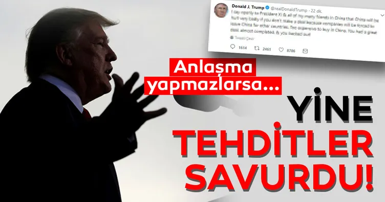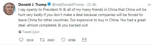 "ABD ile bir anlaşma yapılmaması halinde bunun Çin'i çok kötü şekilde etkileyeceğini Devlet Başkanı Xi ve birçok Çinli dostuma açık şekilde söyledim" ifadelerini kullanan Trump, "Çünkü tarifeler şirketleri Çin'i başka ülkeler için terk etmeye zorlayacak. Çin'den alım yapmak çok pahalı olacak" dedi.