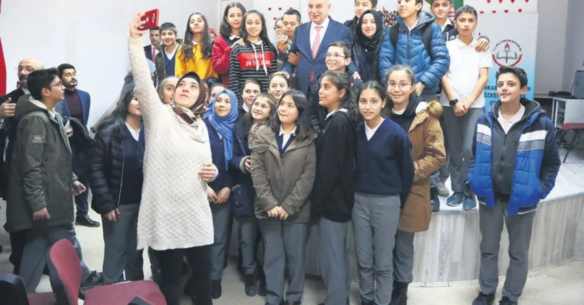 "Başkanım Okulumda" programı kapsamında Özkent Akbilek Ortaokulu'nu ziyaret eden Başkan Altınok, davetliler arasında yer alan Milli Sporcu Hasan Gökhan Kotan'ı salondaki öğrencilere örnek olarak gösteren Altınok