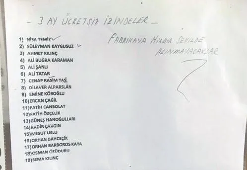 YAPILAN açıklamada çirkin üslup kullanıldı. Pisliğe bahaneler uyduruldu. Ayrıca 19 işçi 3 ay ücretsiz izne çıkarıldı. İşçilerin isimleri liste halinde kapıya asıldı. İsimleri yanına "Fabrikaya hiçbir şekilde alınmayacaklar" ifadesi yer aldı. İşçiler fotoğrafları çekmekle suçlandı.