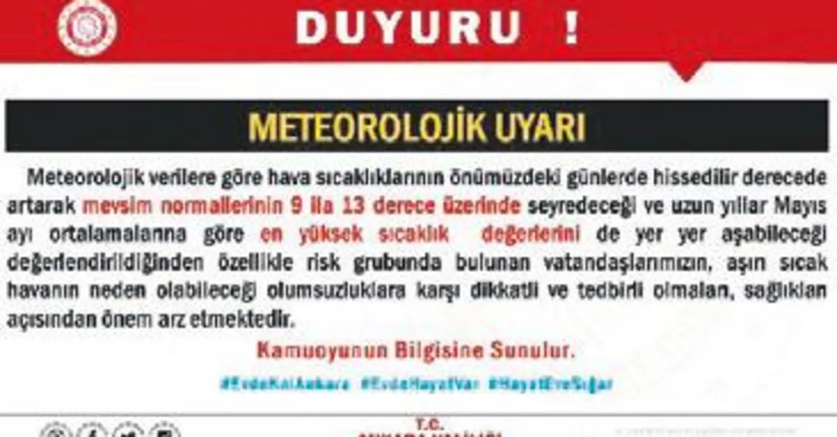 ANKARA Valiliği, önümüzdeki günlerde mevsim normallerinin 9 ile 13 derece üzerinde seyretmesi beklenen hava sıcaklığına karşı halka uyarıda bulundu. Valilikten yapılan yazılı açıklamada, meteorolojik verilere göre hava sıcaklıklarının önümüzdeki günlerde hissedilir derecede artacağı belirtilerek, "Hava sıcaklıklarının mevsim normallerinin 9 ila 13 derece üzerinde seyredeceği ve uzun yıllar mayıs ayı ortalamalarına göre en yüksek sıcaklık değerlerini de yer yer aşabileceği değerlendirildiğinden özellikle risk grubunda bulunan vatandaşlarımızın, aşırı sıcak havanın neden olabileceği olumsuzluklara karşı dikkatli ve tedbirli olmaları, sağlıkları açısından önem arz etmektedir" denildi.