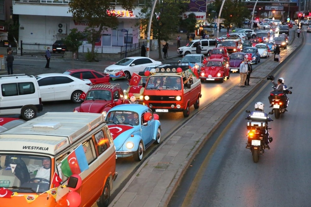 Klasik araçlarla düzenlenen konvoy öncesinde Cumhuriyet coşkusuna ortak olan vatandaşlara hitaben konuşan Başkan Altınok, “Türkiye gerek nüfus anlamında, gerekse coğrafya olarak Türkiye’den büyüktür. Sınırları Edirne’den başlayıp Kars’ta sonlanmaz. Tanrı Dağları, Altaylar, Başkurt, Çuvaş, Avrupa, Orta Doğu, Kafkaslar diyerek uzayıp giden yerlerde Türk nüfusu, yani gönül coğrafyamız vardır. Altaylar’dan ve Tanrı Dağları’ndan süzülerek Anadolu’nun bağrına gelen alperenlerimizi, tüm kahramanlarımızı, şehitlerimizi rahmetle anıyorum. Mertçe savaşarak bizlere dünyanın en güzel coğrafyasında kanla çizilmiş olan cennet parçası bir vatan bıraktılar. Bayrağımız şehidimizin kanı ile sulanmış mübarek bir bayraktır. Bayrağımız; İkbalimiz, istikbalimiz, hürriyetimiz, namusumuz, dinimiz ve şerefimizdir. Rabbim bayrağımızı ebediyete kadar payidar etsin. Minarelerden ezanlarımız dinmesin” ifadelerini kullandı.