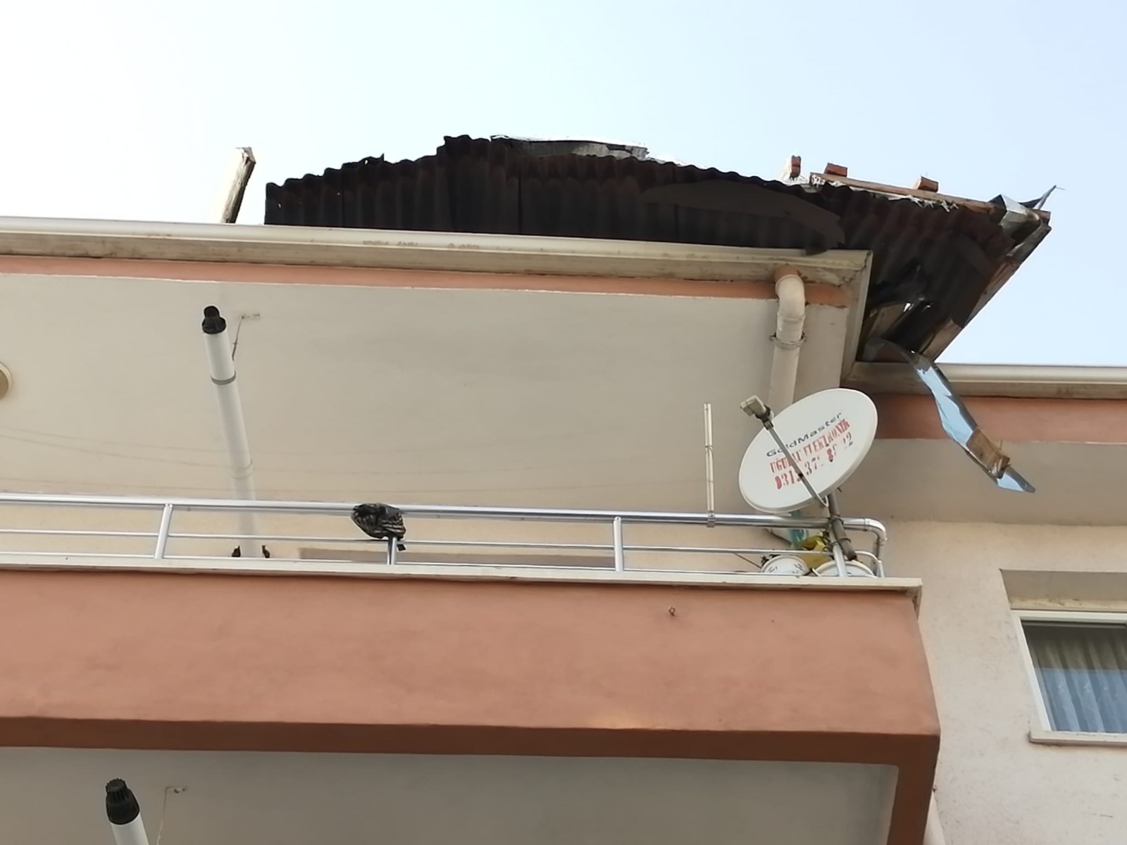 Ankara’da kısa süreli etkili olan şiddetli rüzgar bir binanın çatısını uçurdu. Uçan çatının büyük bir kısmı arkadaki binanın çatısına düşünce her iki binada da hasar oluştu.