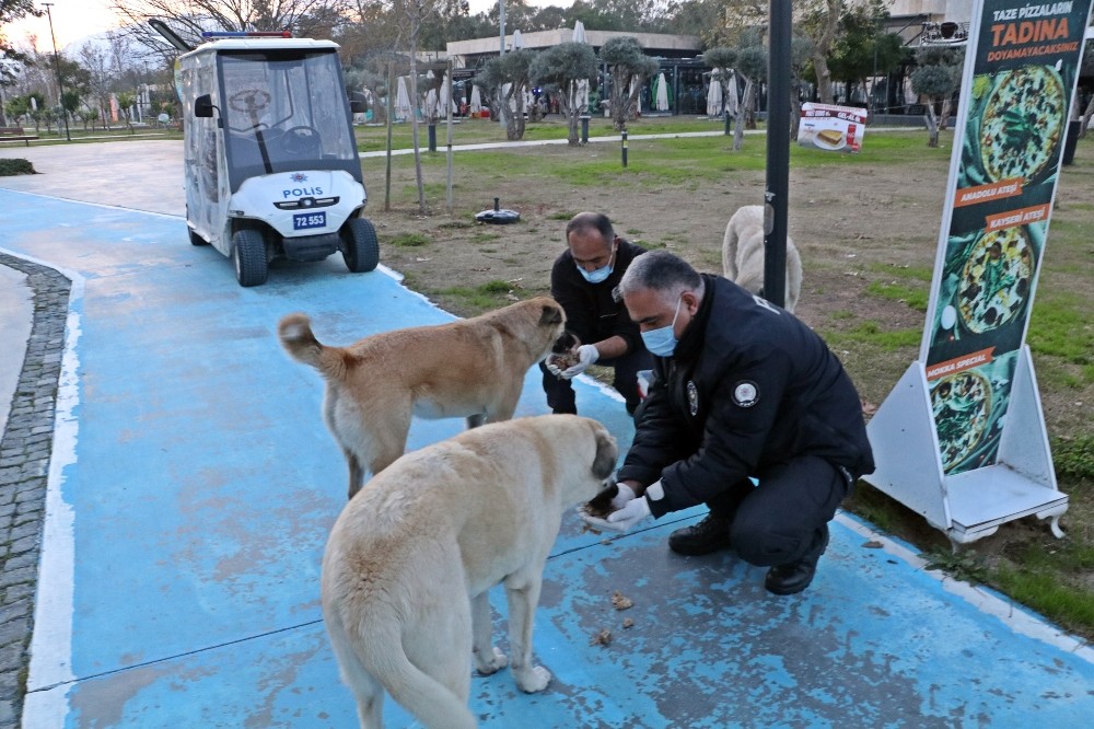 Covid-19 önlemleri kapsamında İçişleri Bakanlığının kısıtlama tedbirleriyle bazı işyerlerinin kapatılması, insanların sokağa çıkamaması sokak hayvanlarını olumsuz etkiledi. Pandemi dönemlerinde zor günler geçiren hayvanların yardımına da polis ekipleri koşuyor. Antalya’nın dünyaca ünlü Konyaaltı Sahili’nde ‘Buggy’ aracıyla devriye görevi yapan Muratpaşa İlçe Emniyet Müdürlüğüne bağlı polis memurları Mustafa Özözen (47) ile Ahmet Küçükbaşol (47) çevre esnaftan kendi maaşlarından aldıkları kemik, ciğer, tavuk etleriyle sahil bandındaki 30 köpek ve sayıları 200’ü bulan kedileri besliyor.