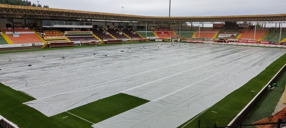 Alanya Belediyesi, Süper Lig maçı öncesi dolu ve kuvvetli yağış ihtimaline karşı Bahçeşehir Okulları Stadyumu’nun çimlerini sera naylonu ile kapattı.