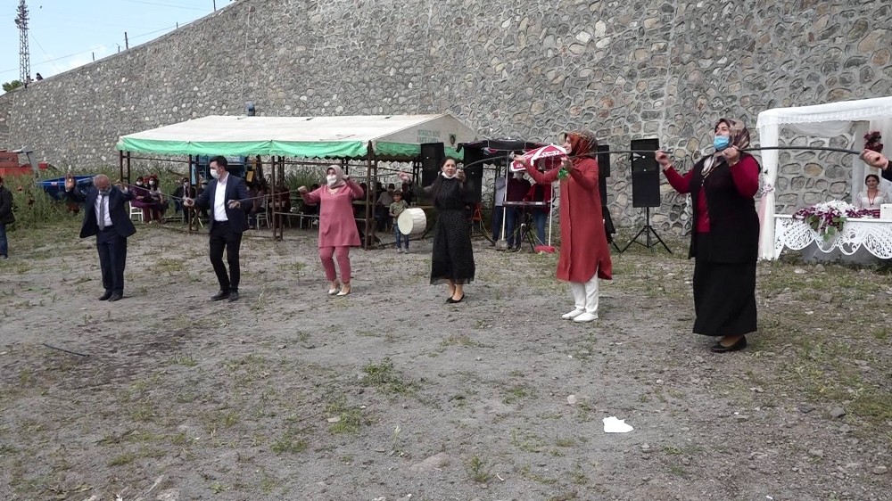 Ardahan’da düğün törenleri yeni tip korona virüs (Covid-19) tedbirleri altında yapılmaya devam ediyor.Yeni normalleşme sürecinde 1 Temmuz’dan itibaren belirlenen korona virüs tedbirleri kapsamında yapılan düğüne sosyal mesafe çubuğuyla çekilen halay damga vurdu. Ardahan merkezde Yıldız çiftinin düğün töreni evlerinin bahçesinde gerçekleşti. Sınırlı sayıda davetlinin katıldığı düğün törenine maskeleriyle gelen misafirler ateşleri ölçülerek sosyal mesafe kuralına göre hazırlanan masalara oturtuldu.Takıların sandığa bırakıldığı düğünde davetliler ayrılınca gelin ve damadın yakın akrabaları maskelerini çıkarmadan sosyal mesafe çubuklarıyla halay çekerek...