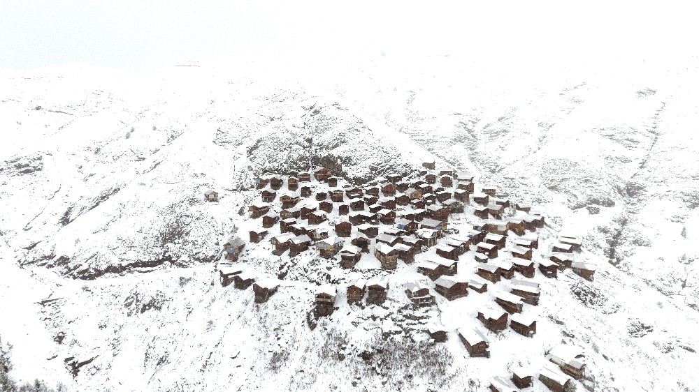 Ahşap evleri ile ünlü yaylanın kar manzarası havadan görüntülendi