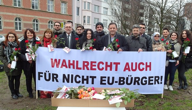 Avrupa Birliği yurttaşı olmayan göçmenler için Kuzey Ren Vestfalya (NRW) eyaletinde yerel seçim hakkı kampanyası yürüten NRW Yerel Seçimlere Katılma Girişimi, eyalet meclisi önünde güllü eylem yaptı. Girişimin sözcüleri ve yöneticileri, milletvekillerine, meclis çalışanlarına ve meclise gelenlere birer kırmızı gül verdi. Girişim üyeleri, güllere astıkları etiketle de yerel seçim hakkı taleplerini dile getirdi. Girişimin Başkanı Bahattin Gemici, 2 Mart günü eyalet meclisi önünde bir miting yapacaklarını hatırlatarak, gül eylemiyle bu mitinge dikkat çekmek istediklerini söyledi. Ayrıca, sert bir üslup yerine gül dağıtarak, girişimleri için sempati kazanmayı hedeflediklerini vurguladı. Girişime destek veren NRW milletvekilleri Yeşiller'den Arif Ünal ile SPD'den Serdar Yüksel, gül eylemini güzel bir eylem olarak niteledi. Girişimcilerin gül verdiği NRW Anayasa Komisyonu Başkanı SPD'li Rainer Bovermann ise, kendisinin yerel seçim hakkından yana olduğunu söyleyerek, bunun uyum için önemli bir anahtar olduğuna inandığını belirtti. Bovermann, yerel seçim hakkının komisyonun gündeminde olduğunu, bu bahar komisyonun çalışmalarını tamamlayacağını bildirdi. CDU ve FDP’nin dışındaki partiler göçmenlere yerel seçim hakkından yana. Bunlardan FDP'nin evet demesi halinde anayasa değişikliği için üçte iki çoğunluk sağlanıyor. Ne var ki, CDU ile olası koalisyon için FDP, bu konuda CDU ile aynı çizgide bulunuyor.\r\n\r\n