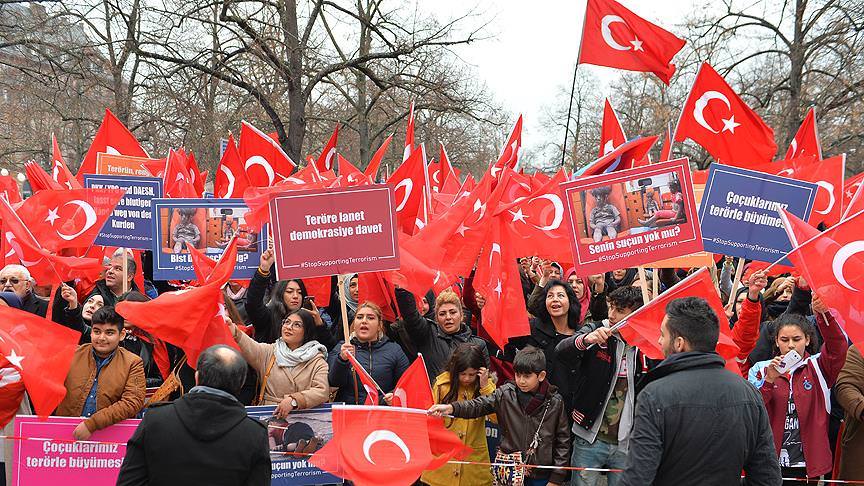 “TERÖRE Lanet, Demokrasiye Davet” adıyla yapılan gösteri, cumartesi günü Lüksemburg’un Theatre\r\nMeydanı ve Fransa’nın Strasbourg, dün de Avusturya’nın başkenti Viyana’da gerçekleştirildi. Istiklal Marşı ve ulusal marşının okunmasıyla başlayan ve yüzlerce kişinin katıldığı gösterilere, Avrupalı Türk Demokratlar Birliği (UETD) başta olmak üzere farklı sivil toplum kuruluşları destek verdi. “Kahrolsun PKK”, “Kahrolsun FETÖ”, “Sehitler ölmez” sloganları atılan gösteride, Türk bayraklarının yani sıra “Terörün dili, dini, ırkı yoktur”, “PKK=DEAS=YGP=PYD=FETÖ” ve “Avrupa’da teröre destek vermeyi bırakın” yazılı dövizler taşındı. Geçen hafta da Almanya, Brüksel, Hollanda ve\r\n Fransa’da benzer mitingler düzenlenmişti.