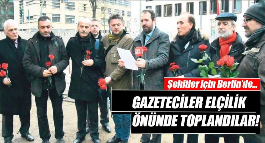 Türkiye'nin Berlin Büyükelçiligi önünde toplanan gazeteciler, bir basın bildirisi okudu ve "Insanlık dısı terör eylemini lanetliyoruz. Terör insanlık dısı bir eylemdir" dedi.