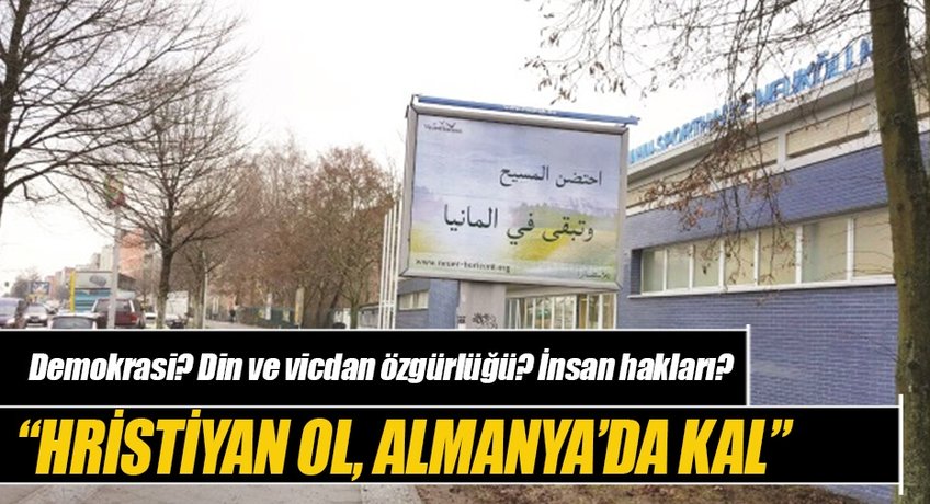 Başkent Berlin'in Neukölln ilçesinde mültecilerin kaldığı yurdun önündeki panoya Arapça reklam veren Neuer Horizont adlı kuruluş "Hristiyan ol, Almanya'da kal" sloganını kullandı.