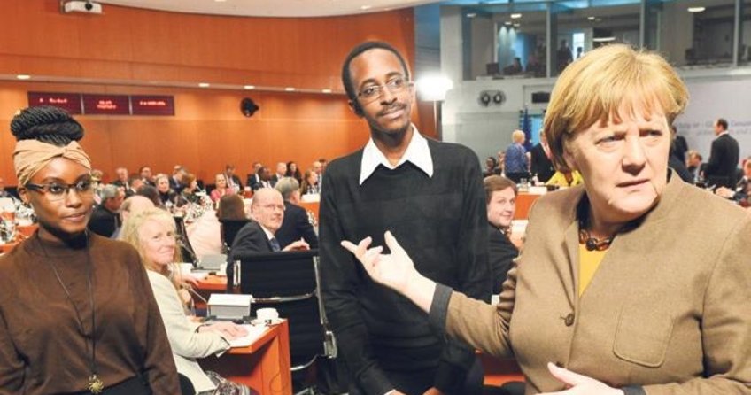 Forum kapsamında yapılan "Insanları Ilgilendiren Seyler - Küresel saglık ve inovasyon" isimli oturuma katılan Sansölye Angela Merkel, Kenya'dan gelen katılımcılar Ethredah Chao (solda) ve Jackson Kiarie (ortada) ile bir süre konustu.