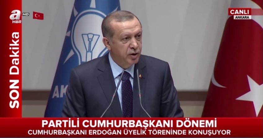 AK Partimizin saygıdeğer munsupları, kurucular kurulumzun MKY, Merkez Disiplin Kurulumzun üyeleri, çok değerli kardeşlerim, hanımefendiler, beyefendiler sizleri en kalbi duygularımla, hasretle, muhabbetle selamlıyorum. 27 Ağustos 2014 tarihinde milletimiz tarafından Cumhurbaşkanlığı görevine seçilmem sebebiyle Anayasa gereği ayrılmak zorunda kaldığım kurucusu olduğum partime, yuvama, sevdama, aşkıma bugün yeniden dönüyorum. Tam 979 gün sonra bu hasret hamdolsun sona eriyor. Bugün burada bir kez daha selamünaleyküm diyerek heyetinizin içine tekrar dahil oluyorum.