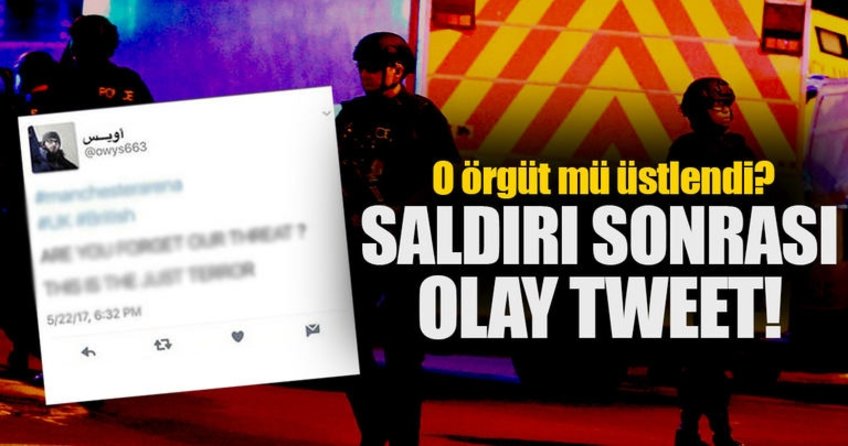 Owys663 (Üveys) adlı Twitter kullanıcısı akşam 6.32'de attığı tweet'te, konserin yapıldığı "Manchester Arena" etiketini kullanıp "Tehdidimizi unuttunuz mu? Bu adil bir terör" ifadesini kullandı.