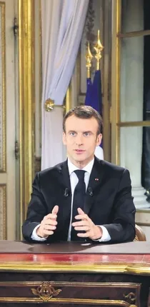 Fransız basınına yansıyan ayrıntılarda, Macron'un ulusa sesleniş konuşmasını General Charles de Gaulle'den beri tüm cumhurbaşkanlarının kullandığı Elysee Sarayı'nın en kıymetli parçalarından biri olan rokoko tarzı gösterişli bir masada yapması dikkat çetki. Yayına yansımayan fakat fotoğraflarda seçilebilen masada iki altın lamba, üç antik kitap ve Fransa'nın sembolü olan bir de altın horoz bulunduğu görüldü. Macron'un ulusa seslenişinde, Altın Oda'nın altın kaplama kapıları da kameralara yansımazken, Cumhurbaşkanı'nın arkasında Fransa ve Avrupa Birliği'nin bayrakları görüldü.