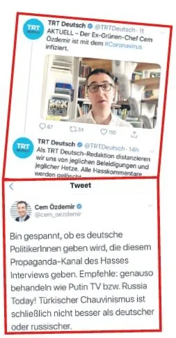 TRT Deutsch'un paylaştığı haberin altındaki eleştirilere isyan eden Özdemir, TRT Deutsch'u açık şekilde hedef gösterdi. Özdemir, "Bakalım, bu nefretin propaganda kanalına röportaj veren Alman siyasiler olacak mı? Tavsiyem, aynı Putin TV veya Russia Today muamelesi çekmek. Türk şovenizmi sonuçta Alman veya Rus şovenizminden iyi değildir" dedi. Özdemir'in hedef göstermesiyle birlikte ırkçılar TRT Deutsch'u hedef aldı. BERLİN