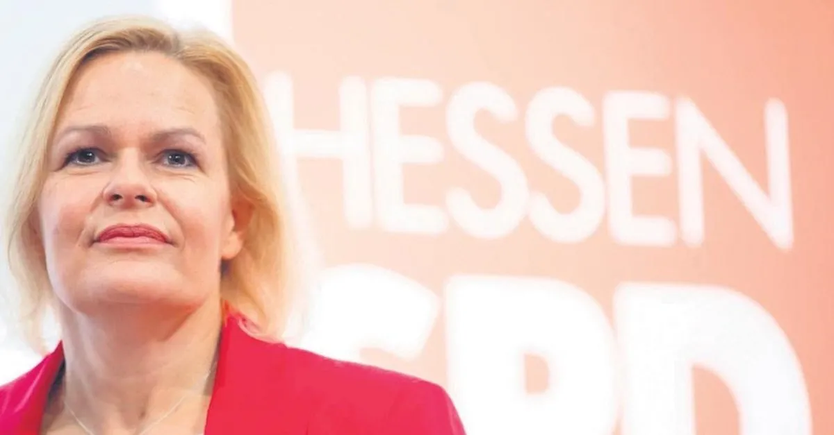 Almanya Federal İçişleri Bakanı Nancy Faeser'in (52) Hessen Eyaleti başbakanlığı için istekli olduğu belirtildi. Faeser'in, eyalette önümüzdeki yıl sonbaharda gerçekleşecek parlamento seçimi öncesi verdiği röportajlarında, "Karar elbette parti komiteleri tarafından verilecek" diyerek adaylığa açık olduğu ifade edildi. Bakan, şu anda SPD'nin Hessen Eyalet Teşkilat Başkanlığını da yürütüyor.
