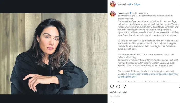 , "Depremden sonra askıya aldığım işlerime dönmem gerekiyor" dedi. Nazan Eckes, daha önceki açıklamasında Alman Johanniter Derneği ile birlikte Gaziantep'te her gün 15 bin kişiye sıcak çorba çıkarttıklarını ve aynı organizasyonu Hatay'da yapmayı planladıklarını aktarmıştı. Eckes, geçtiğimiz yıl RTL televizyonundaki sunuculuğunu bıraktığını açıklamıştı.