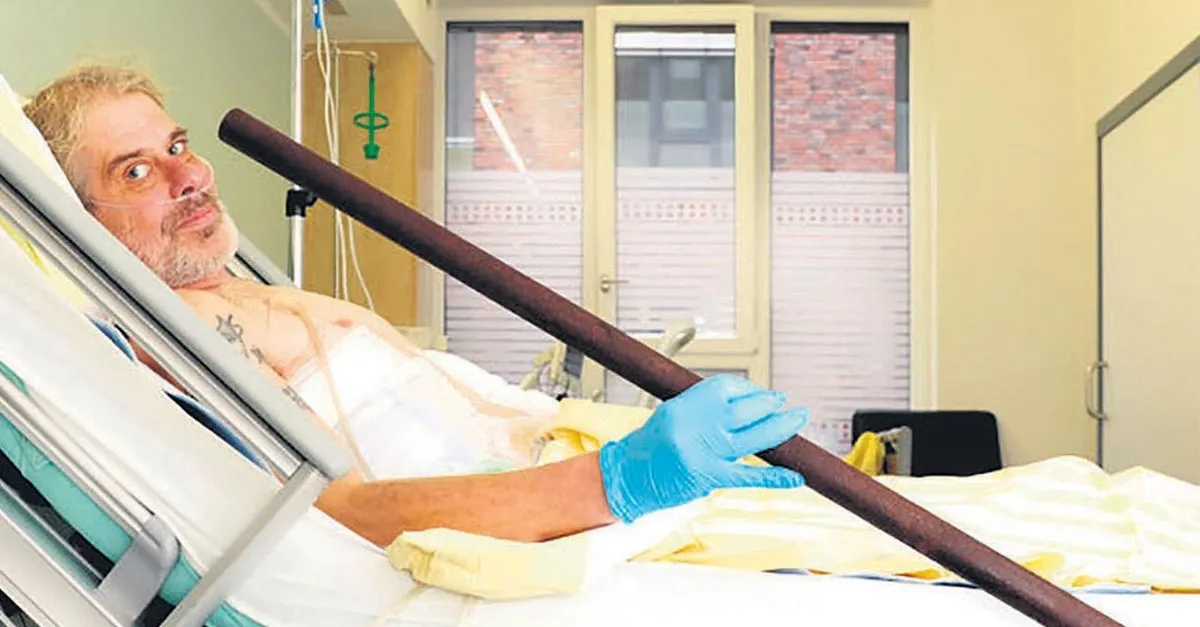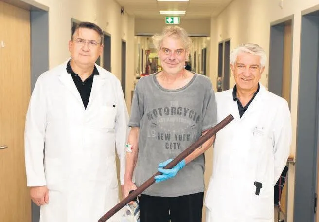 Cuxhaven kentinde yaşayan Frank Vaorin (55), evinin bahçesindeki ağaçları budarken bir metreden uzun çit direğinin üzerine düştü. Paslı metal direk, Varion'unun vücuduna boydan boya saplandı.
