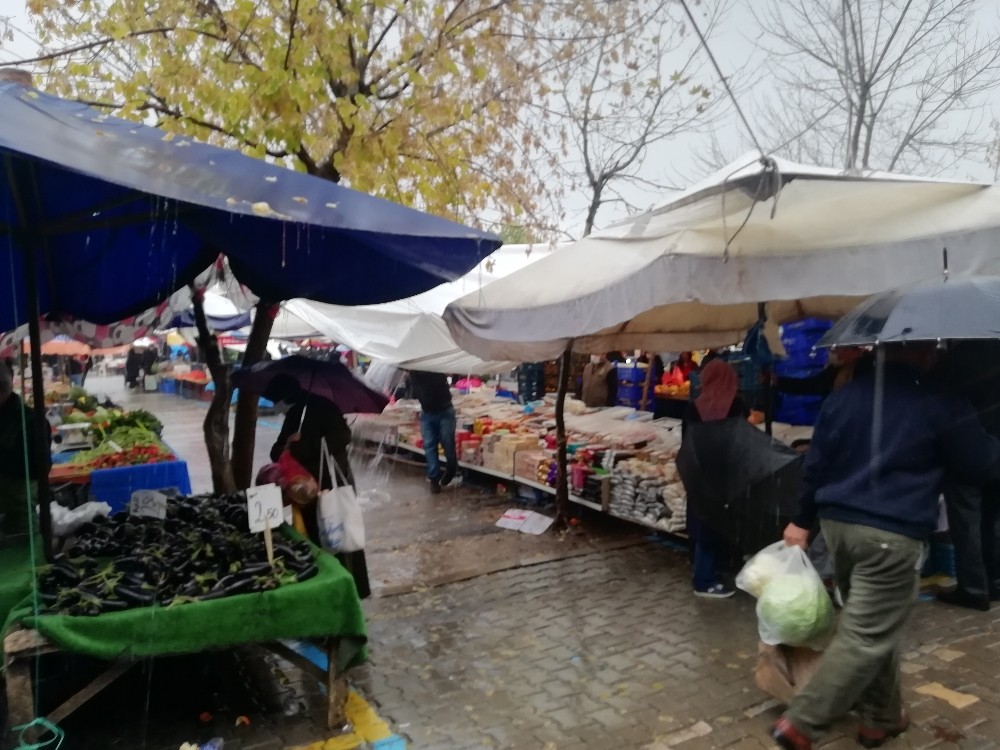 Manyas’ta Cumartesi günleri kurulan halk pazarında yağmurlu havaya teslim oldu.