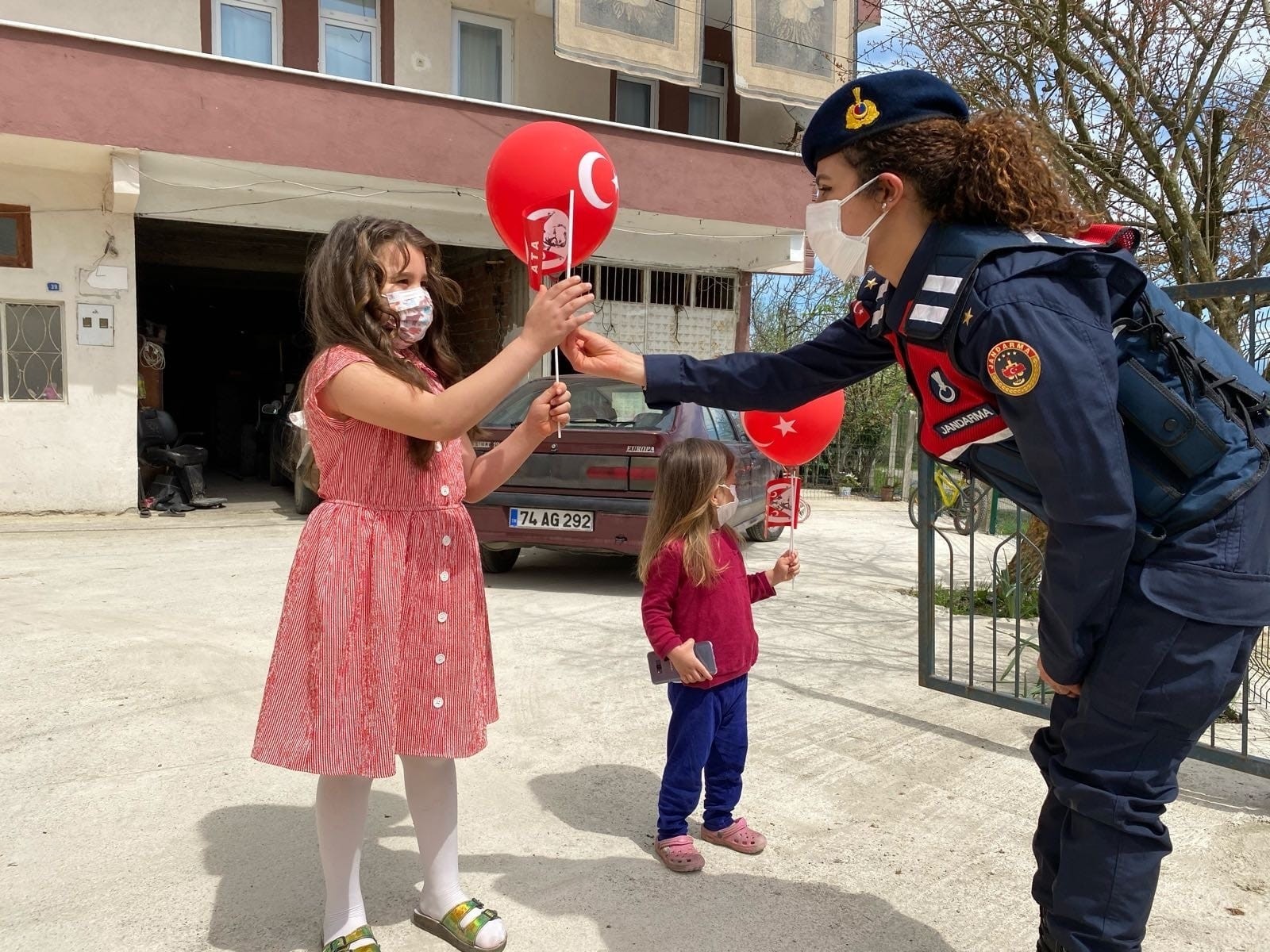 Bartın İl Jandarma Komutanlığına bağlı ekipler, köylerde yaşayan çocuklara 23 Nisan Ulusal Egemenlik ve Çocuk Bayramı coşkusunu yaşattı.Bartın’da minik öğrenciler, Covid-19 tedbirleri nedeniyle 23 Nisan Ulusal Egemenlik ve Çocuk Bayramı’nı evlerinde kutladı. Kent merkezinde araç konvoyu düzenlenirken köylerde yaşayan çocuklar içinse İl Jandarma Komutanlığına bağlı ekipler harekete geçti. Köylerde çocukları ziyaret eden jandarma ekipleri çocukların bayramını kutlayarak balon ve Türk bayrakları hediye etti. Çocukların sevinç ve coşkuyla karşıladıkları jandarma ekiplerinin hediyeleri ile büyük mutluluk yaşadıkları görüldü.