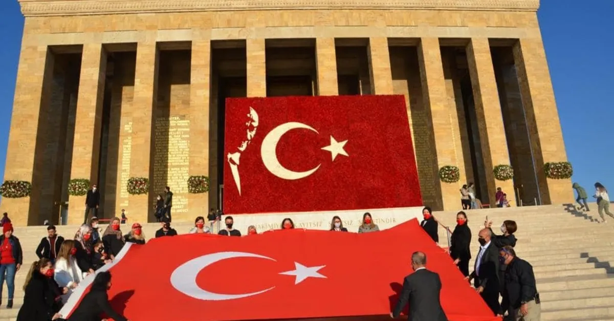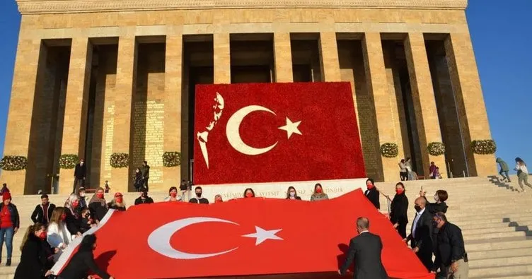 Bolu Polis Eşleri Derneği Şube Başkanı Aksoy ve şehit aileleri, Bolu'dan getirdikleri Türk Bayrağı'nı Anıtkabir merdivenlerinde açarak hatıra fotoğrafı çektirdiler.