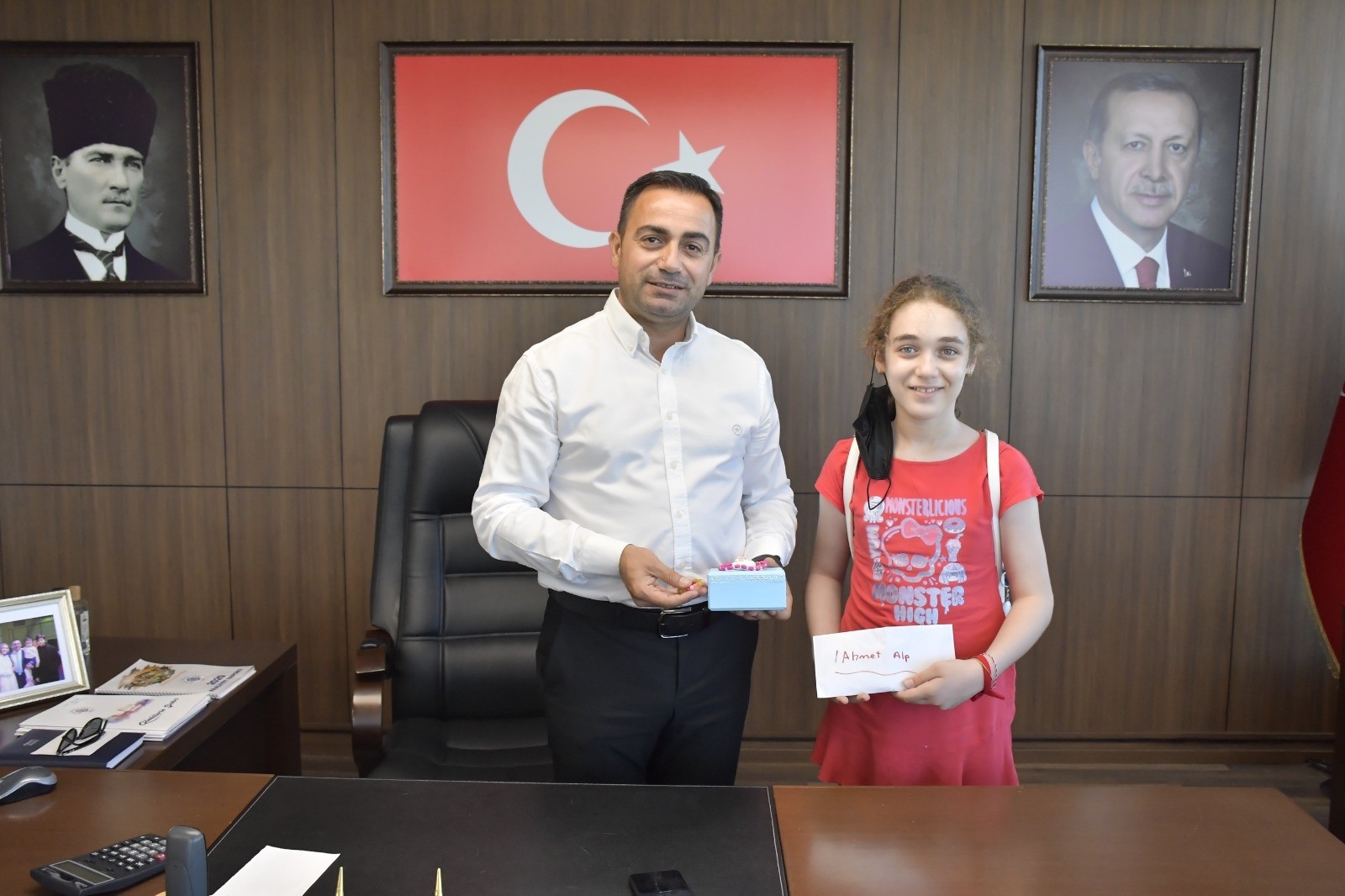 Biga Belediye Başkanı Bülent Erdoğan’ı ziyaret eden Elifnaz, projesini anlatarak, bileklikleri satarak elde ettiği son geliri Ahmet Alp’in kampanyasına vermek üzere Başkan Erdoğan’a teslim etti.