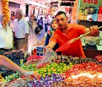Ali Muhittin Hacı Bekir'e... Hacı Bekir'in Eminönü'ndeki karşılıklı iki şubesinin vitrinlerinde '475. Bayram' ibaresi var. Yani tam 475 bayramdır burada lokum ve şekerleme satılıyor. Eminönündeki şekerci esnaf, satışlar açısından genellikle bu bayramdan şikayetçi. Çünkü bayram tatili dokuz güne çıkınca, çoğu İstanbullu tatile gitmiş ve şeker alışverişini rafa kaldırmış. Hacı Bekir ise bir klasik olarak satış rakamlarını koruyor. Yalnız satış görevlileri eski bayramlardan dem vurmadan edemiyor. "Eskiden Ramazan'ın yarısında başlardı bayram alışverişleri, şimdi son bir hafta, hatta son üç günde geliyorlar," diyorlar. Hacı Bekir'in ayrıca Taksim'de, Bahçekapı'da ve Kadıköy'de şubeleri var. Çeşitler ve kilo fiyatları ise şöyle: Çifte kavrulmuş lokum 40 TL, meyveli lokumlar 19 TL, Badem ezmesi 50 TL, çikolata kaplı portakal şekeri 40 TL. Eminönü'ndeki yine yılların şekercisi