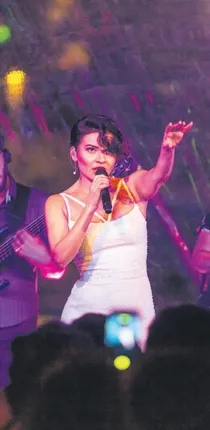 Ve nihayet beklenen an... Göksel sade, hafif yırtmaçlı beyaz elbisesi ve pembe stilettolarıyla fırlıyor sahneye. Saçlar yine dağınık topuz. 60'lar-70'ler naifliği, 2010'lar enerjisi, alıngan kız çocuğundan en dudak ısırtan bir kadınsılığa ani geçişler yapan tavırlarıyla; terkibinin sırrı kendisinde saklı özel bir aurası var Göksel'in sahnede...