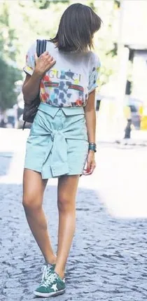 Spor ayakkabı, farklı kesimde Nil yeşili bir etek ve logolu bir tişört... Bu kombinle gün içinde şık olmamak imkansız.