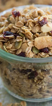 Granola yulaf tanelerinin, bal, fındık, badem, ceviz, kabak çekirdeği gibi kavrulmamış kuru yemiş ve kuru meyvelerle harmanlanmasıyla hazırlanan sağlıklı bir karbonhidrat kaynağı. Diyet lifi, sodyum, potasyum, çinko, demir, fosfor, magnezyum, kalsiyum, E, C ve B grubu vitaminlerinden zengin olan granola güne enerji dolu başlamak için süper bir alternatif. Granolayı hazırladıktan sonra aynen yulaf ya da mısır gevreği gibi süt veya yoğurt ile harmanlayıp taze meyvelerle kahvaltıda ya da ara öğünlerde tüketebilirsiniz.