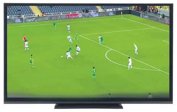Yeşil çimen üstünde hareket eden yeşil formalı oyuncular, ekranda doğru dürüst görülmüyor.