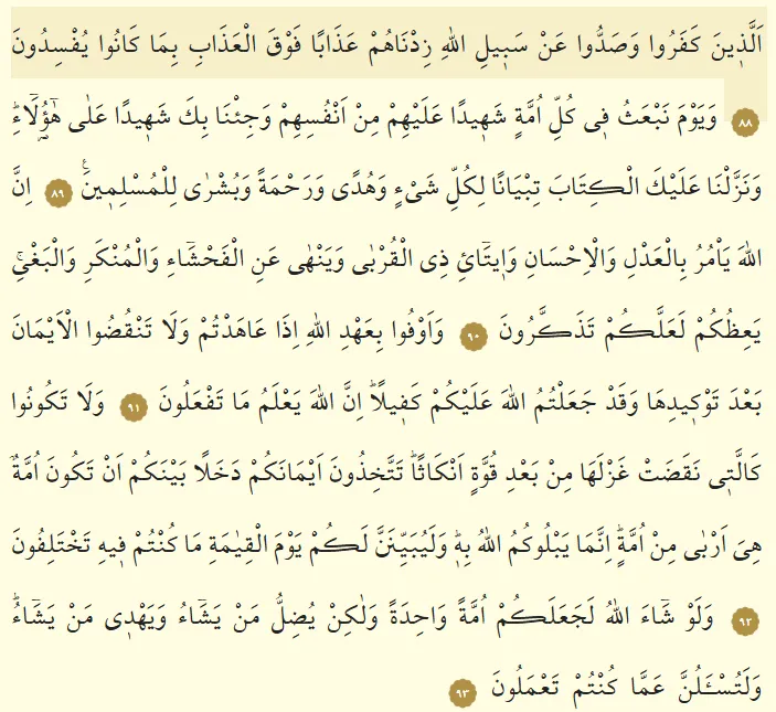 - Yine o gün her ümmetin içinden kendileri hakkında birer tanık çıkaracağız; seni de bu kimseler hakkında tanık yapacağız. Bu kitabı sana her konuda açıklama getiren bir rehber, bir hidayet ve rahmet kaynağı, Allah'a gönülden bağlananlar için bir müjde olarak indirdik.