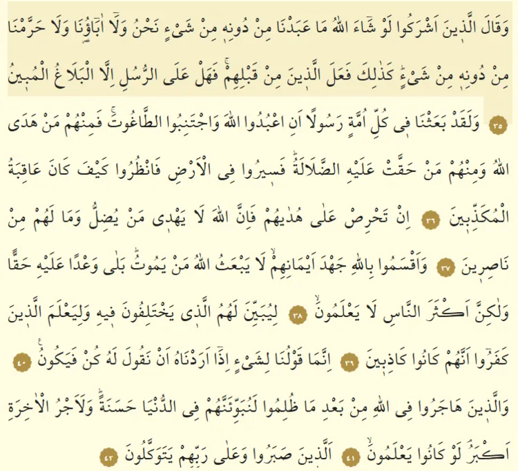 - Müşrikler dediler ki: "Allah isteseydi ne biz ne de atalarımız O'ndan başkasına tapardık. Hiçbir şeyi O'na rağmen haram da saymazdık." Onlardan öncekiler de işte böyle davranmışlardı. Peygamberlerin görevi açık seçik tebliğden başka bir şey değildir.