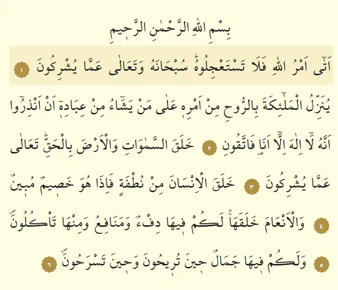 - Allah'ın emri yerine gelecektir; artık onun bir an önce gelmesini isteyip durmayın. Allah, onların ortak koştukları her şeyden uzaktır ve yücedir.