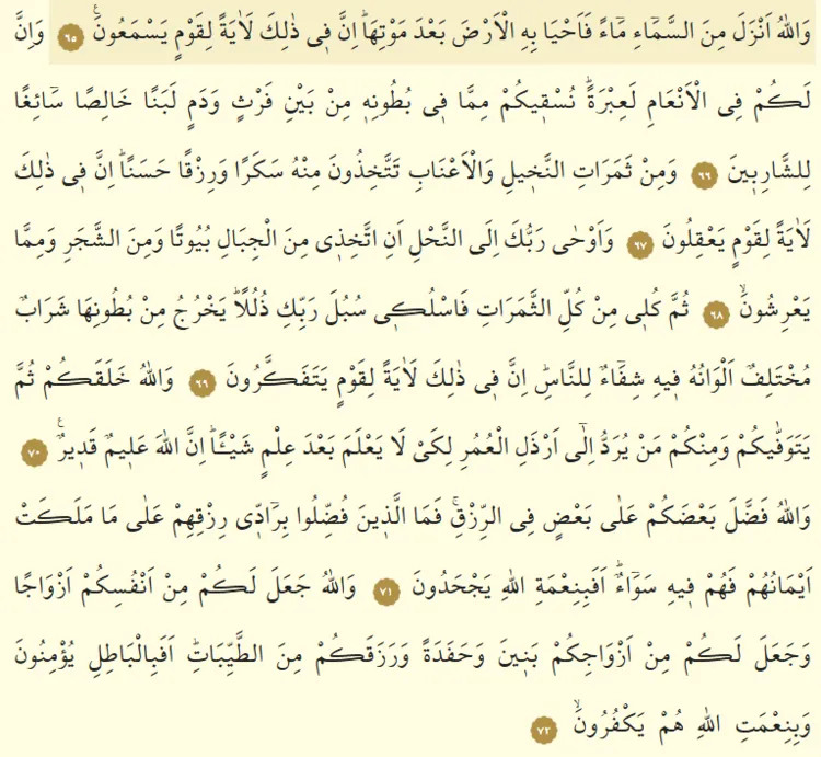 - Sonra her türlü besleyici ürünlerden ye; rabbinin koyduğu kanunlara boyun eğerek çizdiği yollardan git!" Onların karınlarından, farklı renk ve çeşitlerde şerbet (kıvamında bir sıvı) çıkar ki onda insanlara şifa vardır. İşte bunda da düşünen bir topluluk için açık delil bulunmaktadır.