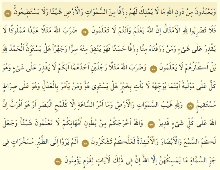 - Yine Allah şu iki insanı örnek veriyor: Biri dilsizdir, elinden hiçbir şey gelmez, efendisinin sırtında yüktür, onu nereye gönderse yararlı bir sonuçla gelmez. Şimdi bununla adaleti emreden ve kendisi de dosdoğru yolda bulunan kimse bir olur mu?