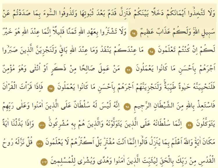 - Antlaşma yaptığınız zaman Allah'a verdiğiniz sözü yerine getirin; Allah'ı kendinize kefil tutarak kesinliğe kavuşturduktan sonra yeminlerinizi bozmayın. Unutmayın ki yaptıklarınızı Allah bilmektedir.