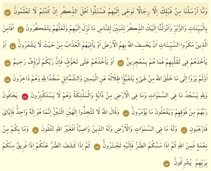 - O peygamberleri apaçık delillerle ve kutsal metinlerle gönderdik. İnsanlara indirileni kendilerine açıklaman için ve (ola ki üzerinde) düşünürler diye sana da uyarıcı kitabı indirdik.
