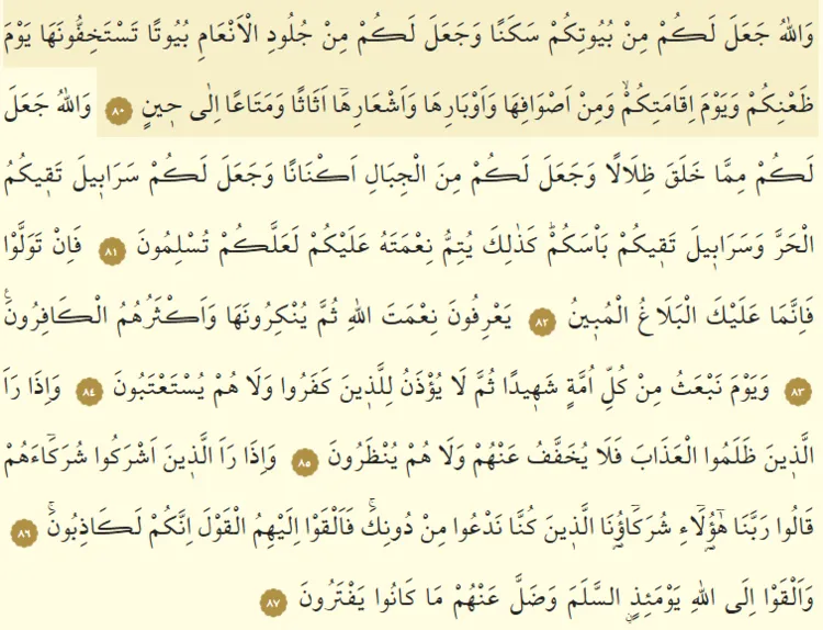 - Allah size evlerinizi huzur yeri yaptı; hayvanların derisinden gerek yolculuk gününüzde gerekse ikamet gününüzde kolaylıkla taşıyabileceğiniz barınaklar yapmanızı; kezâ bir süreye kadar onların yünlerini, yumuşak tüylerini, kıllarını ev ve giyim eşyasıyla ticaret malı olarak değerlendirmenizi sağladı.