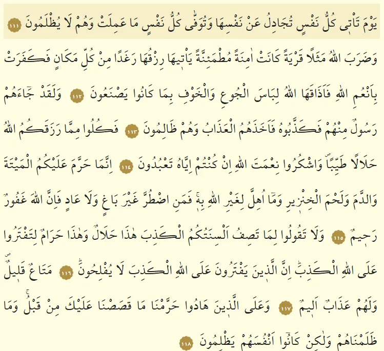 - Allah şöyle bir şehri örnek veriyor: Bu şehir güvenlikli ve huzurluydu; her yerden oraya bol rızık geliyordu. Derken ahalisi Allah'ın nimetlerine karşı nankörlük etti, Allah da onlara yapıp ettikleri yüzünden genel bir açlık ve korku felâketini tattırdı.
